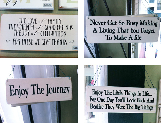 Within the first few minutes I was caught in a frenzy of indecision because I wanted every single thing I saw. So many of the little signs embodied my personal mantra on life and I wanted as many reminders as my Brooklyn apartment could hold. Soon I had a massive pile of little treasures on the counter by the register, teetering on the brink of a “you break it you buy it” disaster and was almost ready to make my purchases when I started noticing gifts that would be perfect for other people. All of a sudden I switched gears, returning many of my things to the shelves and running around the store excitedly picking out gifts with tailored messages for my friends and family: