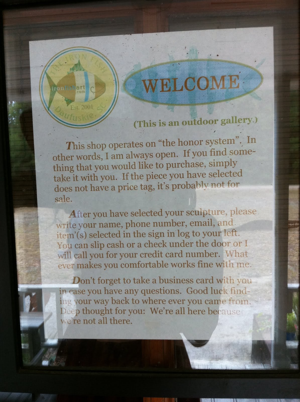 We stopped by a few landmarks including an old schoolhouse for Black children called the Mary Fields School, and the First Union African Baptist Church. My favorite landmark, however, was not listed on the map that we had been holding onto for dear life since we stepped off the ferry. From the road it looked like an old country store so we parked the golf cart under a tree and checked it out. After walking up the creaky steps onto the dusty front porch, we were greeted by a sign on the front door that let visitors know that while was nobody was inside, anything they cared to purchase was right there in the “outdoor gallery” where we were standing (the porch). The owner simply asked that customers leave their payment under the door, or a phone number so they could call for credit card processing.
